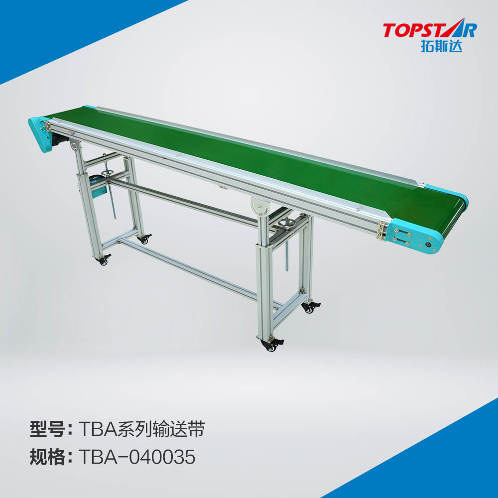 TBA-040035输送带特点: 高端高度:1100~1600mm可调; 低端高度:900~1300mm可调; 光滑或高凸缘防落PUR皮带结构,或者采用光滑带叶片的PUR皮带; 容易调节高度和坡度; 铝合金结构,装有带刹车的轮子; 设计制造符合CE标准; 可根据客户特殊需求,订做尺寸。