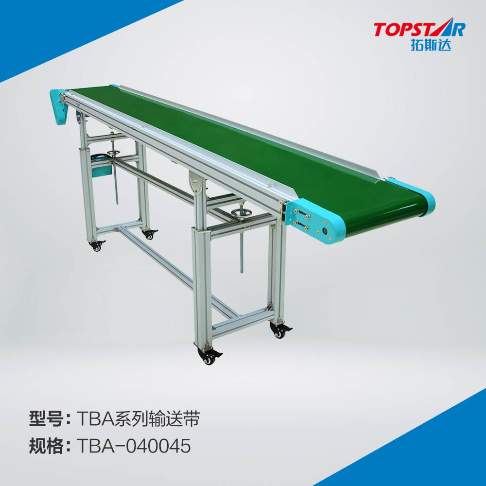 TBA-040045输送带特点: 高端高度:1100~1600mm可调; 低端高度:900~1300mm可调; 光滑或高凸缘防落PUR皮带结构,或者采用光滑带叶片的PUR皮带; 容易调节高度和坡度; 铝合金结构,装有带刹车的轮子; 设计制造符合CE标准; 可根据客户特殊需求,订做尺寸。