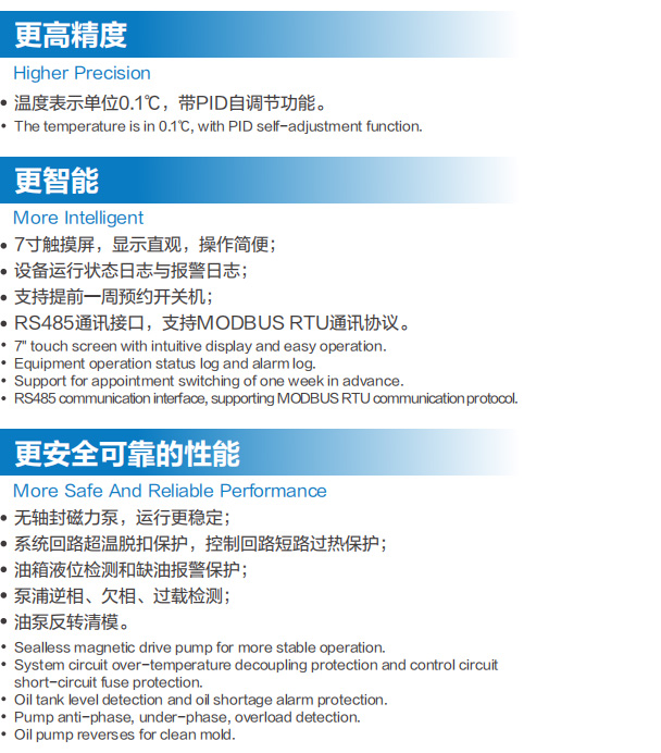 TTOP-324040高温油温机特点: 采用七寸触摸屏设计,操作简单; 采用拓斯达自主研发控制器,温度控制精准稳定,可达±0.1℃; 无轴封磁力泵,运行更稳定; 油箱液位检测和缺油报警保护; 系统回路超温脱扣保护,控制回路短路过热保护; 泵浦逆相、欠相、过载、超温检测; 油泵反转清模。